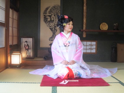 今回は虎の掛け軸を後ろに配していますが、お好みによって掛け軸を掛け替えることも可能です。ほんのり灯りが点された室内からは、花嫁の心模様がにじみ出ます。